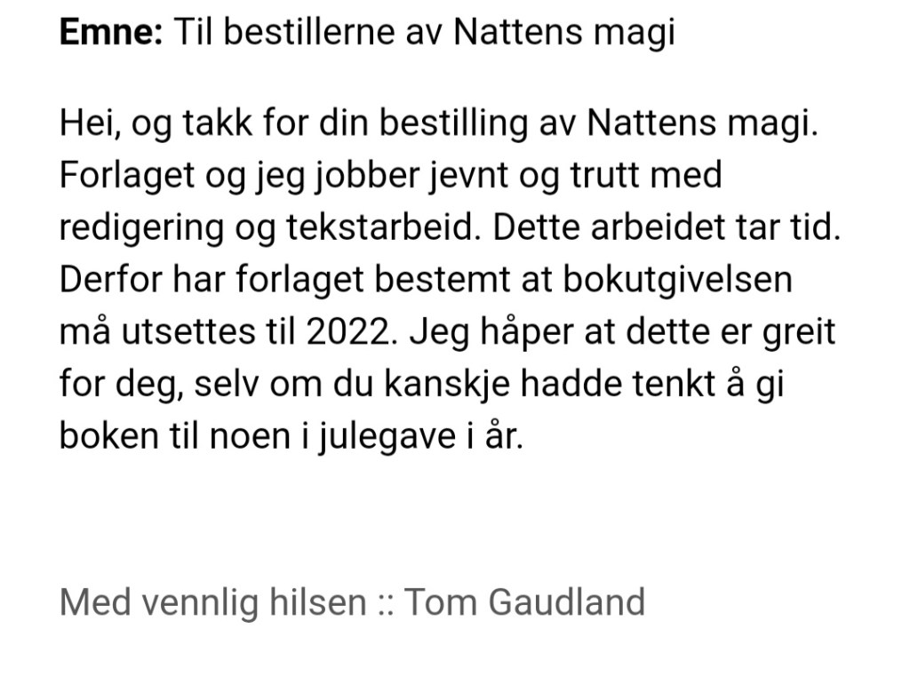 Noen ganger må det tid til for å få ting akkurat slik det skal være. Så når forlaget og redaktøren sier de vil gjøre jobben perfekt setter jeg stor pris på det. Det handler ofte om å ikke være bare en i havet av andre bøker men også DEN boka som skal komme frem. Det er ca 40 bøker om dagen som blir utgitt i norge. Det er jo ikke rent få. Da må alt være som det skal.